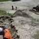 Работы ведет подрядчик - "Промремсервис". По проекту, здесь после засыпки размывов будет восстановлен склон - либо вымощен бетонными плитами, либо армирован и залит бетоном. Примерная продолжительность работ - месяц. Сегодня рабочие очищали проезжую часть улицы Ленина от песка, вымытого из-под моста.