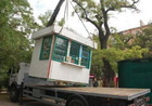 Первый МАФ был снят возле магазина "Малинка" на Кима (в прошлом "Космос"). Несмотря на не очень активное сопротивление владельца (можно увидеть на фото в красной футболке, как он держит лоток рукой во время подъема краном и загрузки на машину) техникой горводоканала временное сооружение было демонтировано и увезено на территорию того же водоканала.