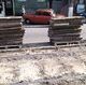 Рабочие снимают старые плиты и складируют их вдоль дороги. На их место планируется положить новые.
