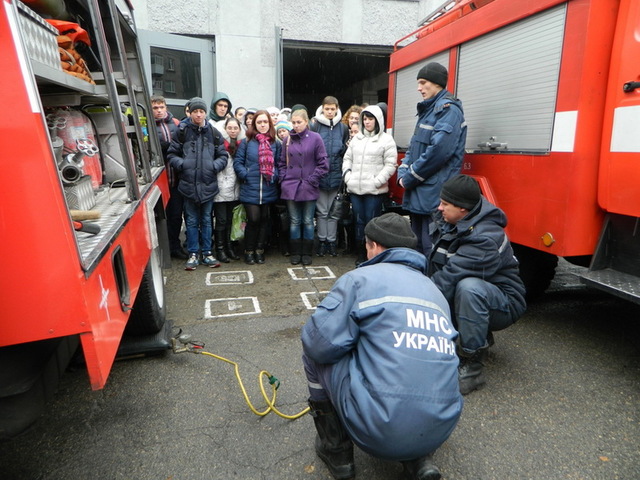 Перед фасадом пожарно-спасательного подразделения личный состав спасателей продемонстрировал молодому поколению спецтехнику, которая непосредственно выезжает на ликвидацию пожаров и последствий разного рода чрезвычайных происшествий. Также пожарные подробно рассказали и продемонстрировали специальное оборудование, которое используется при тушении пожаров и ликвидации последствий чрезвычайных происшествий. Кроме того, студенты узнали, что во время работы в задымленном помещении пожарные надевают аппараты защиты органов дыхания и работают в составе звена газодымозащитной службы. Сотрудники ГСЧС объяснили, что кислорода в таком аппарате хватает пожарном на 30 минут работы в задымленном помещении. Также была продемонстрирована в действии пневмоподушка, с помощью которой можно освободить человека из-под завала, открыть двери лифта и т.д. Желающие имели возможность примерить теплоотражающий костюм, который надевается во время работы при повышенной или высокой температуры окружающей среды, интенсивного теплового излучения и длительного действия пламени.