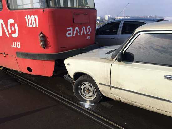 Сегодня, 14 февраля, на Амурском мосту произошло ДТП. Столкнулись трамвай и ВАЗ 2106.