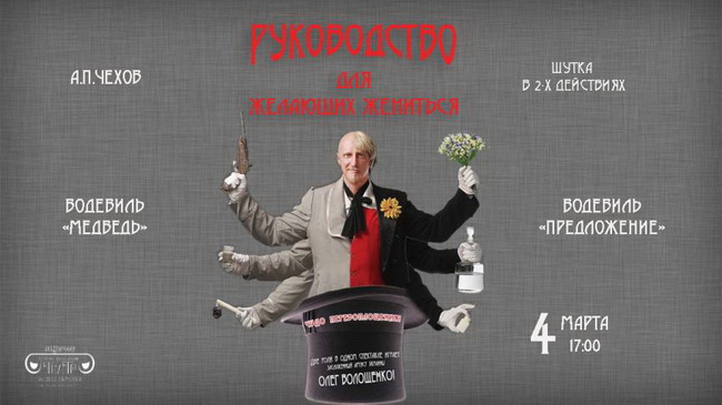 Что ж, будем с нетерпением ждать субботнего вечера, чтобы встретиться с чеховскими героями. Напомним, что партнерами Олега в спектакле «Руководство для желающих жениться» будут Марина Юрченко и Александр Тарханов в «Медведе», а также – Анна Бахмут и Александр Нагорный в «Предложении».