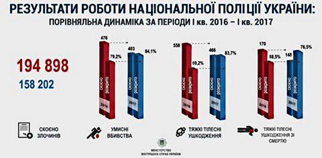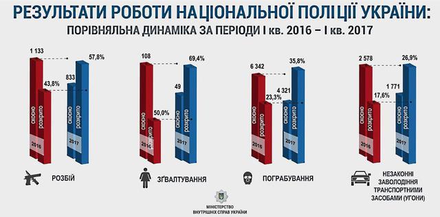 Глава Министерства внутренних дел Украины Арсен Аваков обнародовал данные, согласно которым в первом квартале 2017 по сравнению с этим периодом 2016 увеличился процент раскрываемости преступлений Национальной полицией и сократился уровень преступности.
