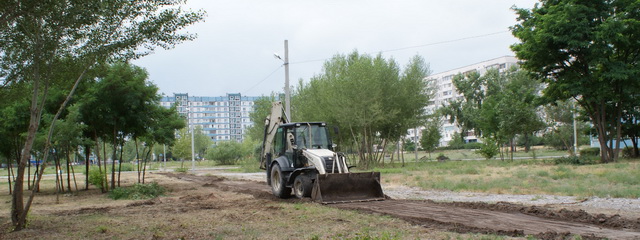 По периметру парковой зоны уже частично проложены бетонные дорожки с тротуарной плиткой. Установлены новые осветительные опоры, проводится планирование местности.