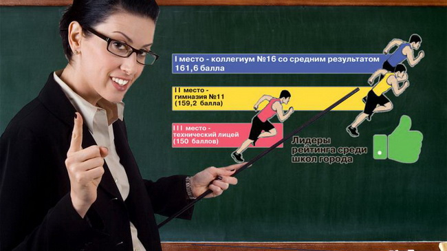 1-е место - технический лицей №1 (159,7 балла, 402-е место по стране (кстати, более 70 человек, принявших участие в сдаче теста по математике)); 2-е место - гимназия №11(154,7 балла, 638-е место в общем рейтинге); 3-е место - лицей №2 (153,9 балла, 693-е место по стране); 4-е место - коллегиум №16 (145,7); 5-е место - школа №8 (139,4). Лидер не изменился - в математике лицей №1 - на уровне «Бог», хотя разница в этот раз между его «преследователями» сократилась, а гимназия №11 вышла на 2-е место. 1-е место - коллегиум №16 (164,1 балла, 205-е место по стране); 2-е место - гимназия №11 (161,1, 320-е место по стране); 3-е место - школа №19 (137,5, 1522-е место по стране); 4-е место - школа №9 (135,5); 5-е место - школа №10 (134,4). Тут поменялись местами 1 и 2 место, что касается остальных, их результаты значительно отличаются от первых двух мест. 1-е место - коллегиум №16 (158,2 б., 278-е место в общем рейтинге); 2 место - гимназия №11 (156,4 б., 349-е место в рейтинге по стране); 3-е место - школа №22 (144,6 б., 1194-е место по стране); 4-е место - школа №44 (144,2); 5-е место - школа №26 (142,4). В тройке лидеров произошли изменения: коллегиум №16 поднялся на 1-е место, в тройку вошла гимназия №11.