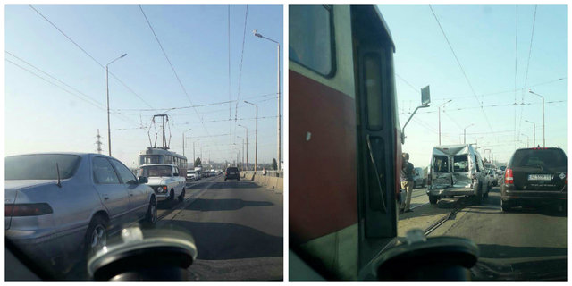 Напомним, пару дней назад на этом же мосту в это же время была подобная авария — столкнулись три автомобиля и трамвай. Как это произошло, смотрите здесь.