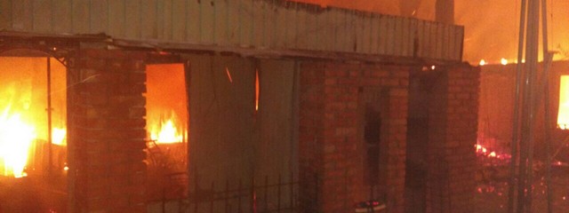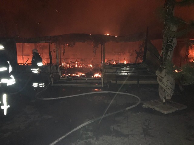 Прибыв на место пожара огнеборцы установили, что горит главное сооружение кафе, беседка, склад и хозяйственное помещение.