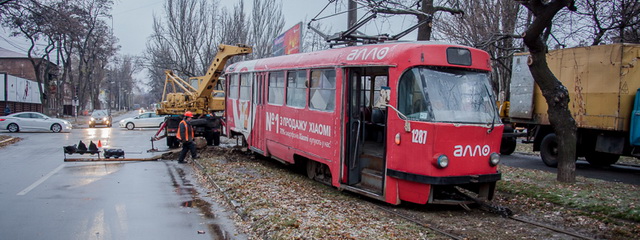 29 ноября на пересечении улиц Владимира Антоновича и Юрия Савченко трамвай сошел с рельсов и снес светофор. Кузов электротранспорта развернуло поперек трамвайных путей.