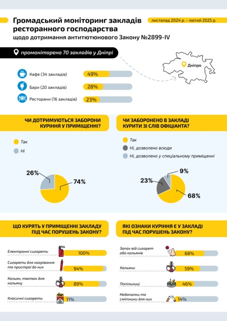 У 84% закладів ресторанного господарства не було зафіксовано жодної реклами тютюнових виробів, пристроїв для нагрівання тютюну або кальянів. У Дніпрі цей показник складає 77%. Натомість порушниками у Дніпрі найчастіше була використана реклама через дописи у соціальних мережах про куріння кальянів (88%), присутність кальянів у паперовому або електронному меню (69%), частина вивіски зображувала кальян (13%), вітрини з сигаретами або ТВЕН (6%), присутність сигарет, ТВЕН або пристроїв у паперовому або електронному меню (6%), табличка IQOS Friendly (6%).