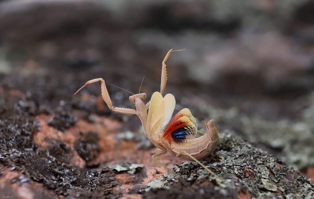 Этот вид богомолов обитает на части Евразии, включая территорию Украины. Он отличается яркими задними крыльями с малиновым или оранжевым основанием, большим темно-синим пятном и характерной полоской вдоль тела, которое достигает в длину 5 сантиметров.