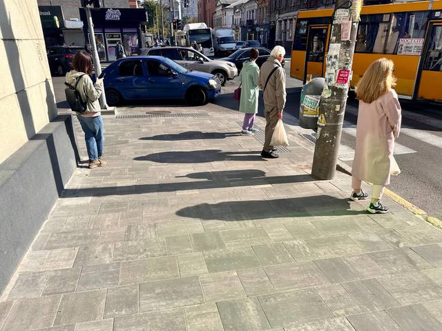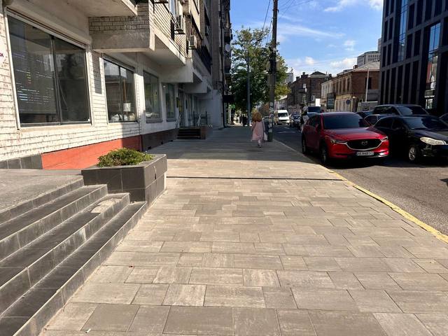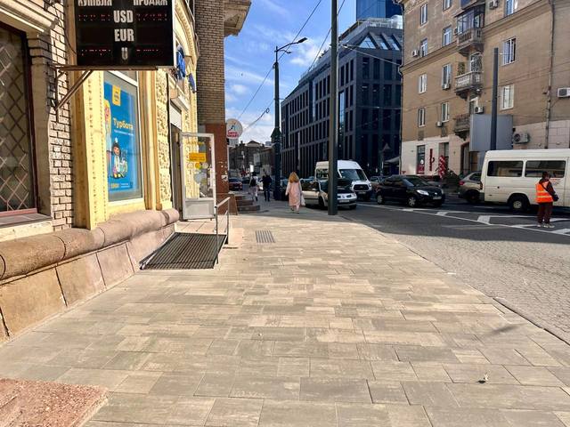 "Главное, что использовали стандартный формат плитки без фаски и тактильную плитку цвета «графит». Причем это они сами приняли такое решение, не обращались за советами или помощью.Также под каждую трубу дождевой канализации провели лотки с решетками. К сожалению, в условиях Днепра они быстро забьются листьями и грязью, потому что балансодержатели их не обслуживают.