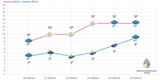 На початку тижня область продовжить знаходитись під впливом циклону з північного сходу, утримається дощова погода. Температура вночі 3..7°, вдень 8..13°.