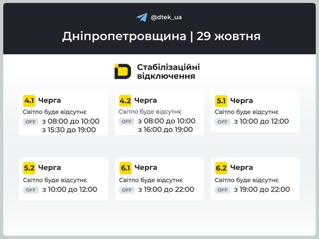 За розпорядженням диспетчерського центру НЕК "Укренерго", 29 жовтня з 08:00 до 22:00 застосовуватимуться відключення електроенергії.