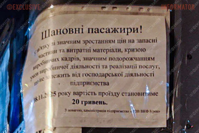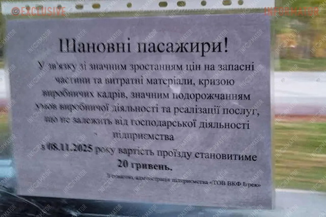 «В связи со значительным ростом цен на запасные части и расходные материалы, кризисом производственных кадров, значительным удорожанием условий производственной деятельности и реализации услуг, не зависящим от хозяйственной деятельности предприятия, с 8 ноября 2025 года стоимость проезда составит 20 гривен», - указано в объявлениях.
