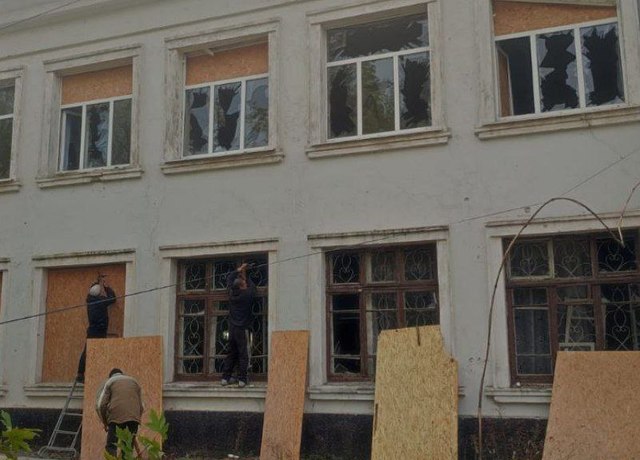 Изуродованы магазины и торговые павильоны, кафе, парикмахерская, пятиэтажка, автомобили.