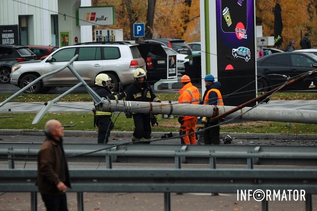 В понедельник, 10 ноября, в Днепре на Набережной Победы, возле АЗС «Окко», произошло серьезное ДТП. Автомобиль BMW въехал в фонарный столб. После столкновения опора повисла на проводах над дорогой. Движение временно перекрыто.