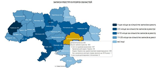 Днепропетровская область оказалась на 5-м месте среди регионов с наибольшим количеством коррупционеров. В реестр внесли 363 записи, из которых 357 – по решению суда. Данные обнародованы в Едином государственном реестре лиц, совершивших коррупционные или связанные с коррупцией правонарушения.