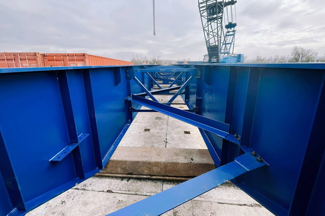 Недавно такой мост длиной 40 метров (2 пролета) начали устанавливать на Днепропетровщине. Там уже установлены крайние и промежуточные опоры, выполнен монтаж ригелей. Продолжаются работы по обустройству опорной стенки из габионов, а также сборка металлических балок. Из-за того, что производителем не предусмотрена опорная часть под балки пролетного сооружения, подрядной организации необходимо изготовить эти элементы.