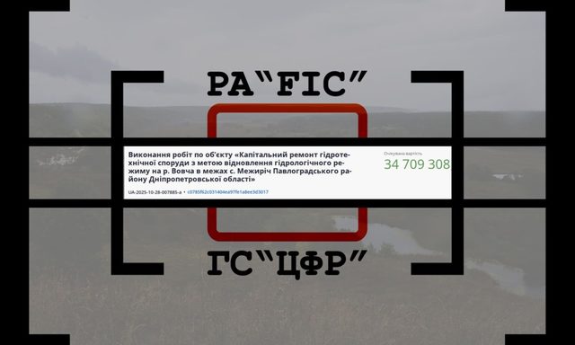 РЕГІОНАЛЬНИЙ ОФІС ВОДНИХ РЕСУРСІВ У ДНІПРОПЕТРОВСЬКІЙ ОБЛАСТІ провів закупівлю на виконання робіт по об’єкту “Капітальний ремонт гідротехнічної споруди з метою відновлення гідрологічного режиму на р. Вовча в межах с. Межиріч Павлоградського району Дніпропетровської області”.