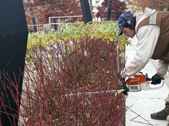 Во-вторых, осуществляется стрижка дерна белого сорта «Элегантисимо». Осенняя обрезка стимулирует появление новых побегов, которые зимой приобретают интенсивный красный цвет, формируя выразительный декоративный акцент в городском пространстве.
