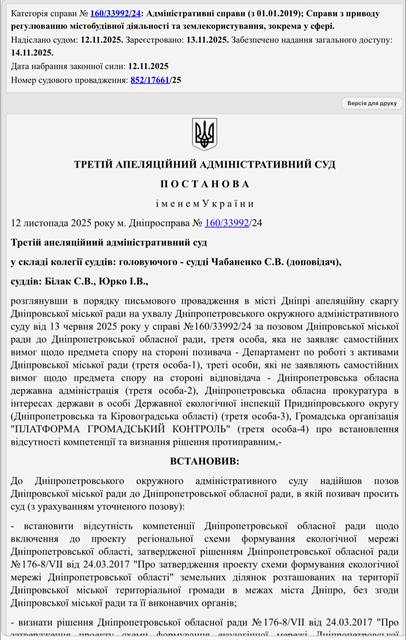 «Третій апеляційний адміністративний суд відхилив скаргу Дніпровської міської ради на ухвалу суду першої інстанції відносно вирішення питання щодо позову ради, то ж питання по екологічній мережі поки залишається закритим.