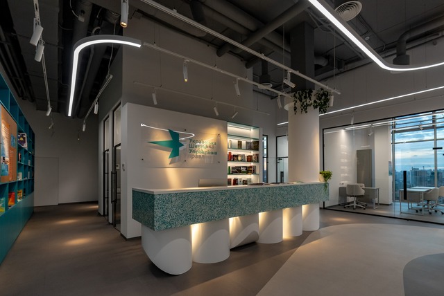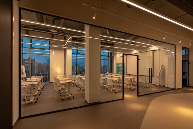 Ми випровадили наше біодинамічне світло, яке підлаштовується під різний час доби та події, і найголовніше – сприяє більш ефективному навчанню. Доповнили простір світловими акцентами та природними патернами для глибини інтер’єру.