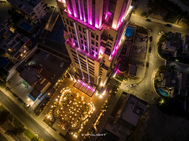 Ми створили єдину систему освітлення, яка об'єднує фасад і територію так, щоб весь комплекс працював як одна жива структура. Усі елементи ми об'єднали в Expolight Cloud Control, що дозволяє керувати освітленням з будь-якої точки світу.