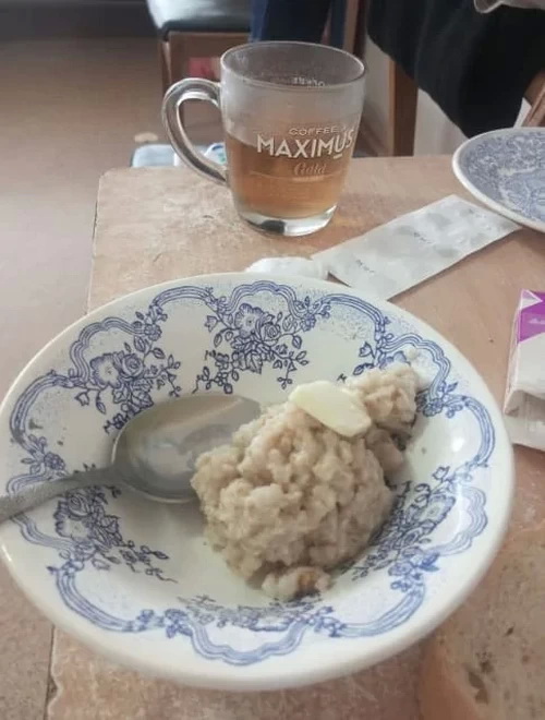Боец Богдан наглядно показал, чем кормят раненных ветеранов в местной больнице. Это – мизерная порция странной каши и чай.