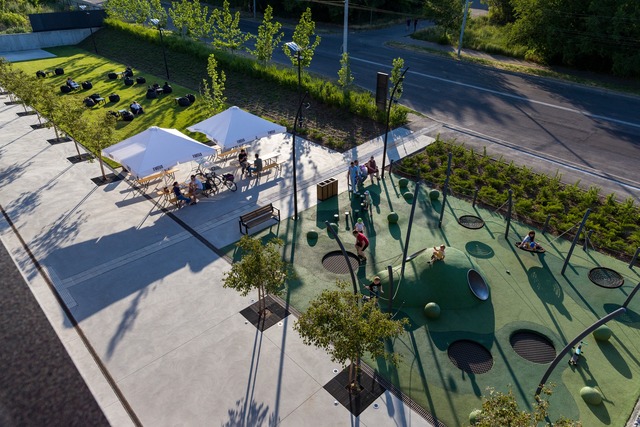 Громадські простори навколо MOVA стали привабленням не лише для відвідувачів, а й для ширшої міської спільноти. Сталий розвиток лежить в основі проєкту. Серед ключових технологій — теплові насоси, сонячна електростанція, твердопаливний парогенератор для опалення та виробництва, а також системи рекуперації тепла для громадських просторів і процесів пивоваріння, включаючи повторне використання попередньо нагрітої води. Вентильована фасадна система та додаткова ізоляція, що перевищує місцеві стандарти на 30%, ще більше знижують споживання енергії. MOVA демонструє, як сталий підхід може поєднати промислову спадщину з сучасними технологіями та екологічною відповідальністю.