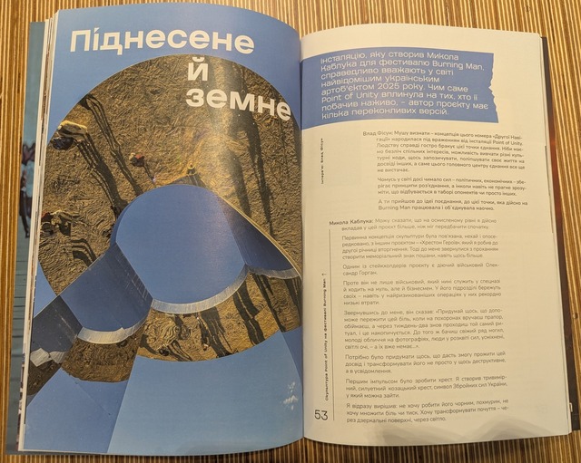 Для мене завжди особливо радісно відчувати підтримку та визнання саме українського ком’юніті. Тому можливість дати розгорнуте інтерв’ю про мою інсталяцію Point of Unity, створену для Burning Man, та побачити її на обкладинці четвертого номера журналу «Друга Навігація» від Work.ua — має для мене велику цінність.