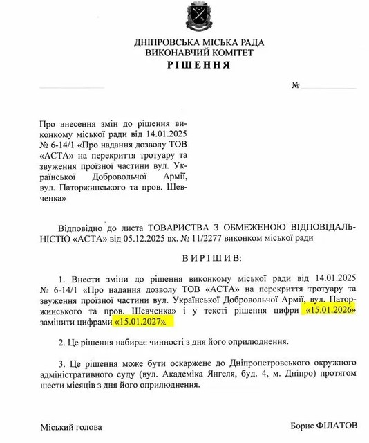В проекте решения говорится об изменениях в постановление исполкома от 14 января 2025 года, которым компания-подрядчик ООО «АСТА» получила разрешение на проведение работ и временные ограничения движения. Теперь срок действия разрешения предлагают продлить еще на год: вместо «15.01.2026» в документе планируют указать новую дату - 15 января 2027 года.