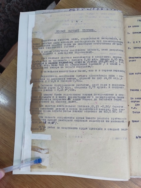 Что разрушило пруд, пока не понятно, возможно люди и события, возможно природные явления и время. Но уже в 30-е годы создаётся спецкомиссия по восстановлению пруда. Ведутся замеры на месте и разрабатывается техдокументация для восстановления рыбного пруда. Чем тогда закончилась эта затея из найденных документов не понятно, но вот уже в документах, времён немецкой оккупации, в 1943 году появляются новые ходатайства, о строительстве дамбы и восстановлении пруда, для продовольственных нужд. За основу берутся ещё советские замеры и показатели, сделанные тогда в середине 30-х, проектируется новый план, бюджет
