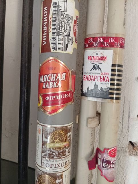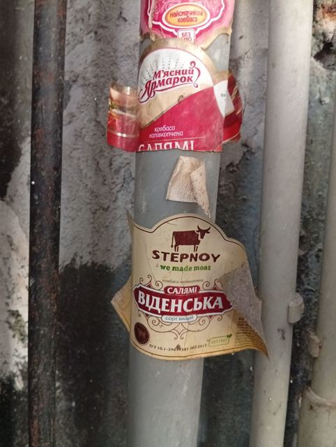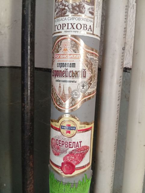 Такую достаточно давнюю (судя по ряду признаков) коллекцию колбасных этикеток я обнаружил на водопроводной трубе в одном из подсобных помещений у себя на работе в театре.