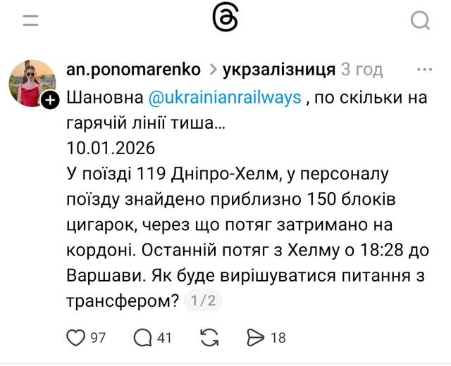 10 січня у соцмережах пасажири розповіли, що поїзд №119 Дніпро - Холм стоїть на українському кордоні більше 3-х годин. З'ясувалося, що митники виявили контрабандні цигарки заховані у вагоні. Чи належать вони комусь із провідників - не відомо. Через затримку пасажири українського поїзда запізнилися на останній рейс із Холма до Варшави.