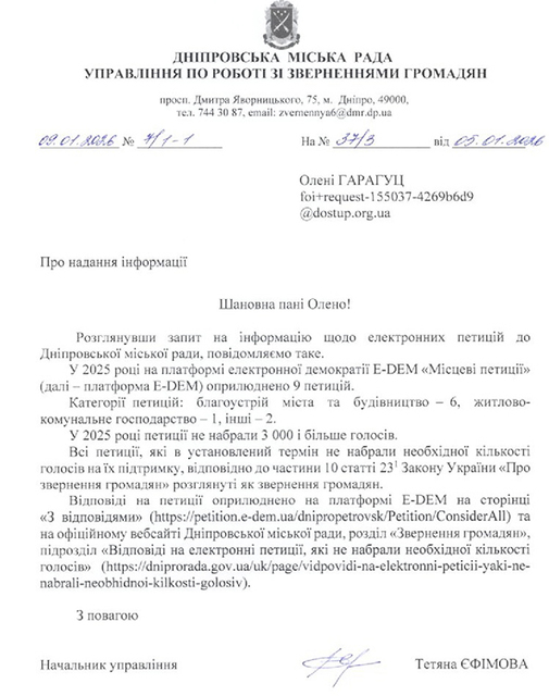 Также она сообщила, что ответы на прошлогодние петиции опубликованы в подразделе «Ответы на электронные петиции, не набравшие необходимое количество голосов» на официальном вебсайте Днепровского городского совета.