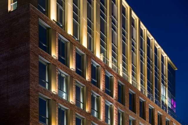Світло тут делікатно підкреслює архітектуру, роблячи фасад виразним у вечірньому місті.