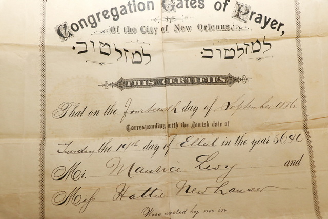 Нинішній дар Музею є офіційним документом про шлюб, укладений 14 вересня 1886 року, що відповідає 14 дню місяця елул 5646 року за єврейським календарем. Свідоцтво засвідчує шлюб Моріса Леві та Хетті Ньюгаузер, членів єврейської громади міста Новий Орлеан, штат Луїзіана, США. Документ оформлено у вигляді друкованого бланка з рукописним заповненням і засвідчено підписом служителя громади Моріса Айзенберга, який підтвердив укладення шлюбу відповідно до законів штату Луїзіана та обряду, проведеного в конгрегації «Врата Молитви» (Congregation Gates of Prayer). Ця конгрегація існує й сьогодні, однак не належить до ортодоксальних течій у юдаїзмі, тож передане свідоцтво не є традиційною ктубою, проте воно залишається цінним історичним джерелом, що відображає практики фіксації шлюбів у єврейських громадах Північної Америки другої половини XIX століття.
