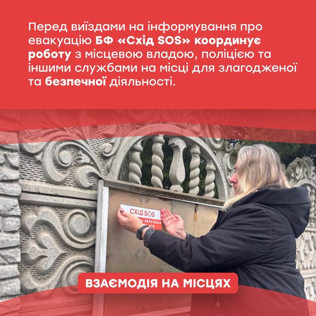 БФ «Схід SOS» безоплатно евакуює адресно. Ми опікуємося представниками маломобільних груп, зокрема й сім’ями з дітьми, людьми з інвалідністю та старшого віку, власниками домашніх улюбленців. Команда супроводжує постраждалих під час пошуку тимчасового місця проживання, розміщує до осель стаціонарного догляду з постійним наглядом або допомагає дістатися близьких.