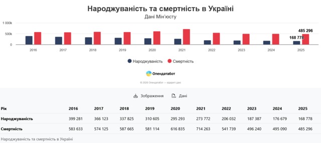 485 296 смертей зафиксировано в Украине в 2025 году. В целом смертность по стране снизилась на 2%. На одного новорожденного приходится трое умерших.