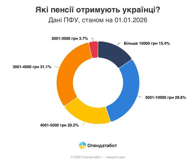 «На 13% зросла середня пенсія за рік та сягла 6 544 грн. Але далеко не всі отримують таку суму: понад третина пенсіонерів живе на близько 3 250 грн, а ще 63 тисячі людей отримують пенсію нижче прожиткового мінімуму. Ще 261 тисяча живуть на мінімум — 2 361 грн.Загалом в Україні понад 10 мільйонів пенсіонерів. Більшість (73%) отримують виплати за віком, ще 15% — по інвалідності, 7% — через втрату годувальника, 5% — за вислугу років.