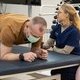 «На занятиях мы выполняем упражнения с осевой нагрузкой, а также нагрузки для укрепления мышц туловища, верхних и нижних конечностей. Сейчас мы на начальном этапе подготовки к протезированию, уже на следующей неделе он поедет делать слепок, после чего будут производить первичный протез. У него уже есть фантомные боли, но раньше он оценивал их на 7 из 10, сейчас – на 2 из 10. Михаил – супермолодец! Еще на первом занятии он сказал: "Я буду делать по максимуму все, что смогу, насколько у меня хватит сил". И придерживается этого до сих пор», — поделилась физическая терапевт Татьяна.