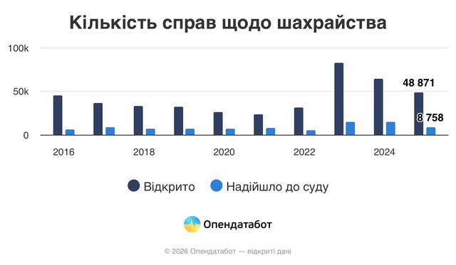 «48 871 кримінальне провадження за шахрайство зафіксовано в Україні торік — на чверть менше, ніж рік тому. Після піку у 2023 році показники постійно спадають.