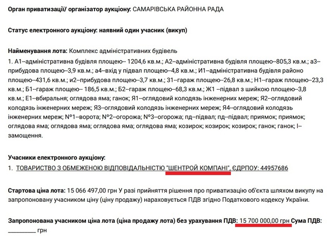 Раніше ЗМІ повідомили, що комплекс адміністративних будівель площею 2.746,4 кв.м, виставлений на трираундовий англійський аукціон, розташований в місті Самар за адресою: вул. Гетьманська, будинок 12. По сусідству, у будинку 14, знаходиться Самарівська міська рада.
