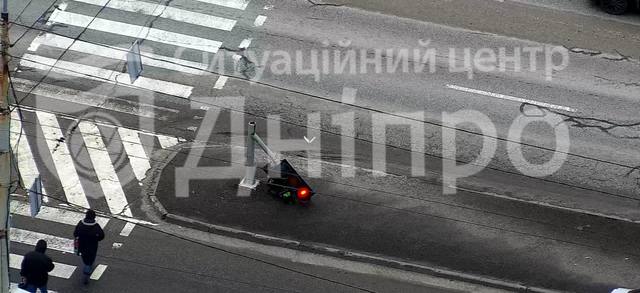 Схожа ситуація і на проспекті Слобожанському. Під тиском вітру не втрималася конструкція світлофора.