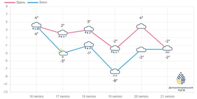 У четвер, 19 лютого, у тилу циклону температура знизиться: вночі -5..-10°, вдень 0..-5°.