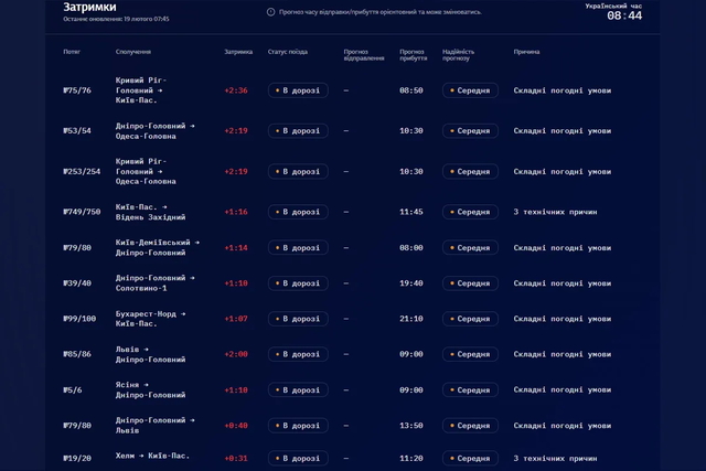 19 февраля ряд поездов, курсирующих через Днепропетровскую область, едут с задержкой. Причина – сложные погодные условия. Задержка некоторых поездов превышает два часа.