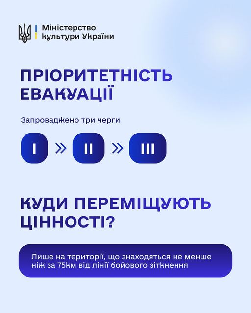 Водночас, евакуйовані цінності можуть розміщуватися лише на територіях, що знаходяться не менше ніж за 75 км від лінії бойового зіткнення.