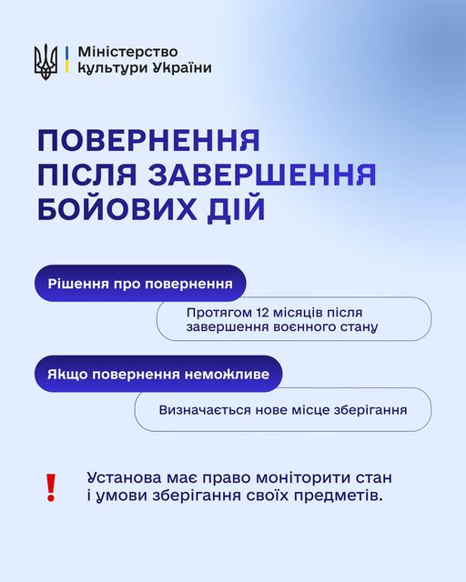 І ще одна важлива норма — рішення про повернення евакуйованих цінностей має бути ухвалене протягом 12 місяців після завершення воєнного стану. Якщо повернення неможливе, то буде визначено нове безпечне місце зберігання. Установа зберігає право контролювати стан своїх предметів.