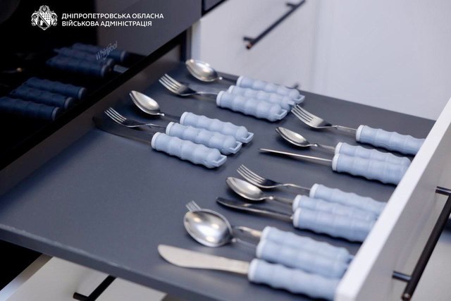 У кімнаті – новий гарнітур. Столи регулюються за висотою. Це зручно для пацієнтів, які пересуваються на кріслі колісному. Є й техніка та спеціальні столові прилади.