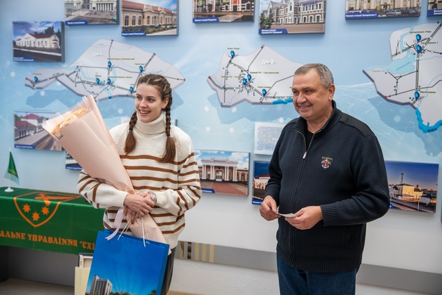 Ще одним приємним моментом для видатної спортсменки стала зустріч з директором регіональної філії «Придніпровська залізниця» Олександром МОМОТОМ: він як гостинний господар привітав Ярославу в залізничній родині, подарував брендовані сувеніри, запросив до свого кабінету на каву й теплу, неформальну бесіду.